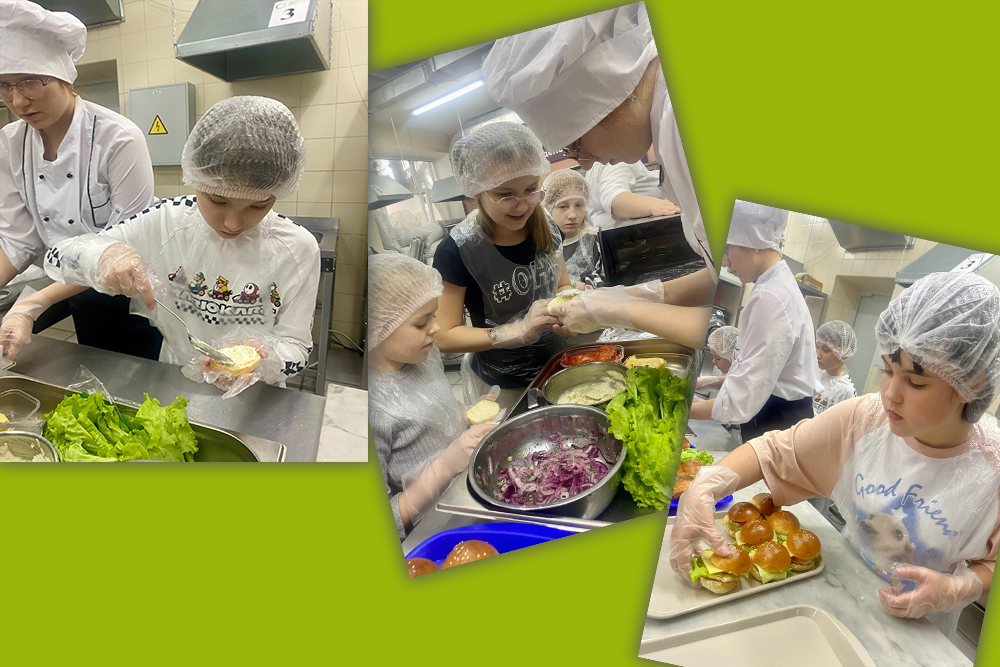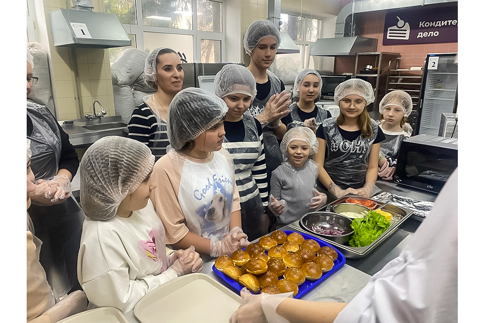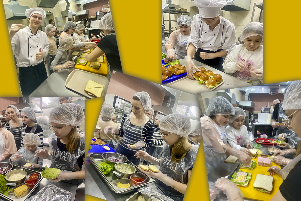 Мероприятие прошло на базе техникума в мастерской "Кондитерское дело" и собрало обучающихся Центра Оберег г. Курска и их родителей, желающих узнать секреты создания вкусных сэндвичей и бургеров.