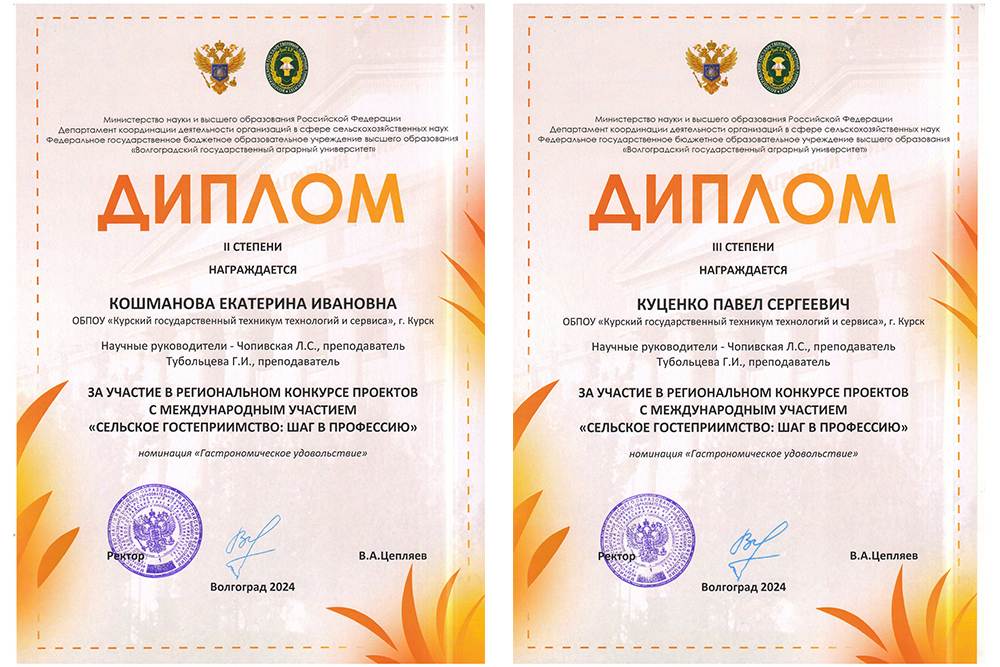 Поздравляем студентов техникума Екатерину Кошманову и Павла Куценко, занявших призовые места в региональном конкурсе с международным участием «Сельское гостеприимство: шаг в профессию» в номинации «Гастрономическое удовольствие».