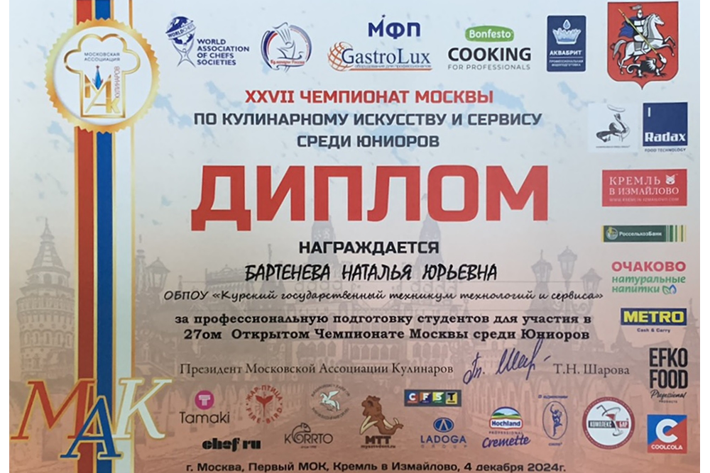 Студенты техникума (наставник - Бартенева Наталья Юрьевна) приняли участие в Открытом чемпионате Москвы по кулинарному искусству и сервису среди юниоров.
