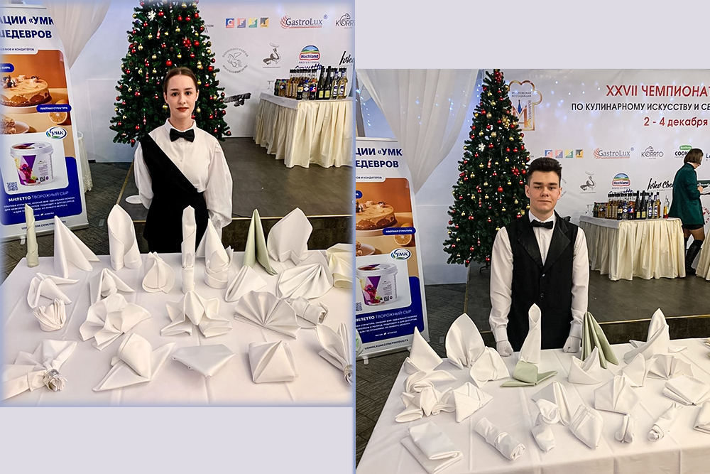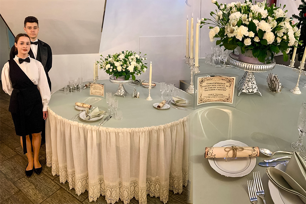 Обучающиеся техникума Раков Артур и Стужная Виктория стали участниками индивидуальных соревнований официантов по тематической сервировке стола по произведениям А.С. Пушкина и продемонстрировали профессиональные навыки художественного складывания салфеток.