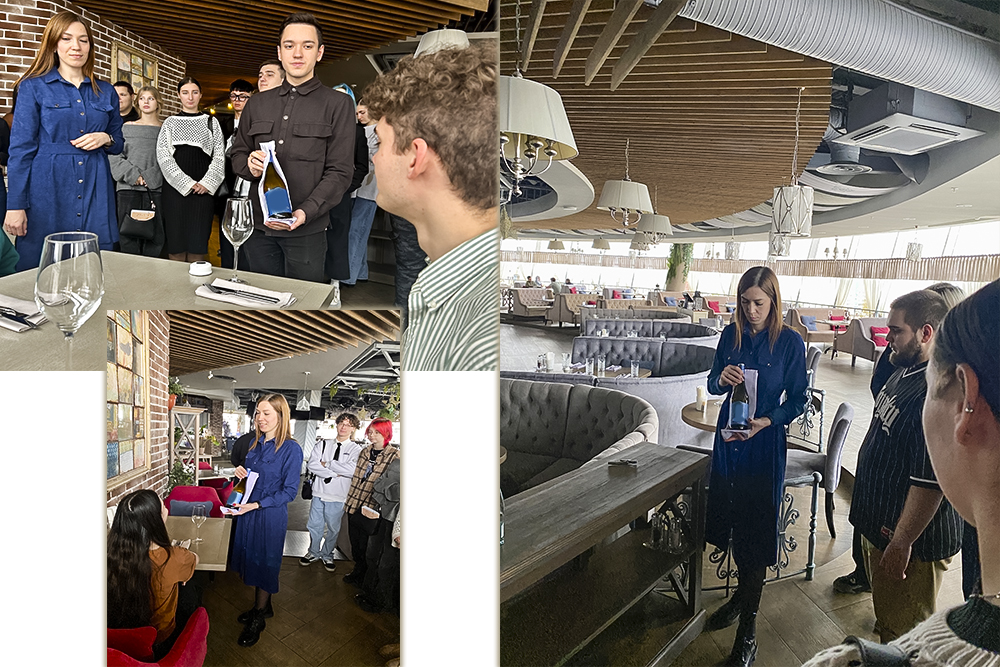 Во время экскурсии по торговому залу ресторана студенты познакомились с тонкостями организации обслуживания, бармен Евгений Еськов провел мастер-класс по приготовлению коктейлей методом «Шейк».